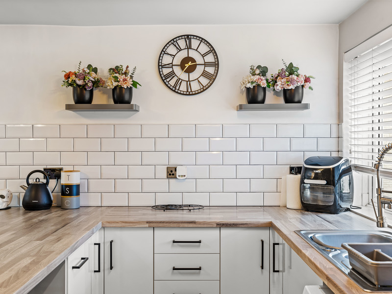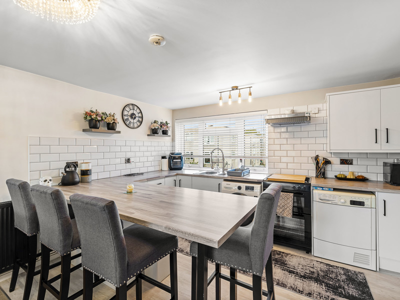 The heart of the home is undoubtedly the expansive 22-foot open-plan lounge and kitchen, flooded with natural light through a generous picture window. The sleek kitchen design features wood-effect worktops, freestanding cooker with hob and metro tile splashbacks, offering both charm and functionality, while a large breakfast bar doubles up as a casual dining space or workstation.