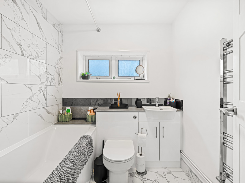 The bedroom, like the rest of the apartment, is bright and spacious, comfortably fitting a king-size bed and additional storage units. The luxurious bathroom has been recently updated with striking marble-effect tiling, contemporary vanity units and chrome fixtures for a clean, high-end feel.
