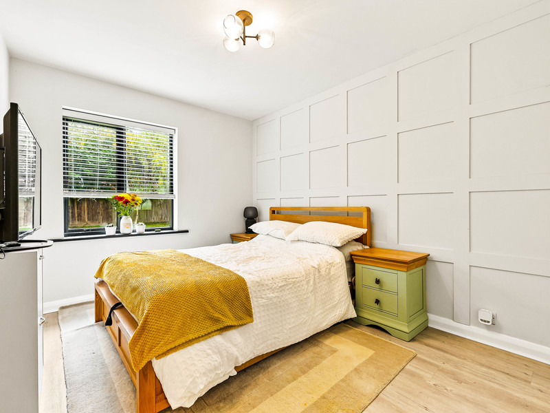 The double bedroom has a large built in wardrobe and looks over the communal garden,