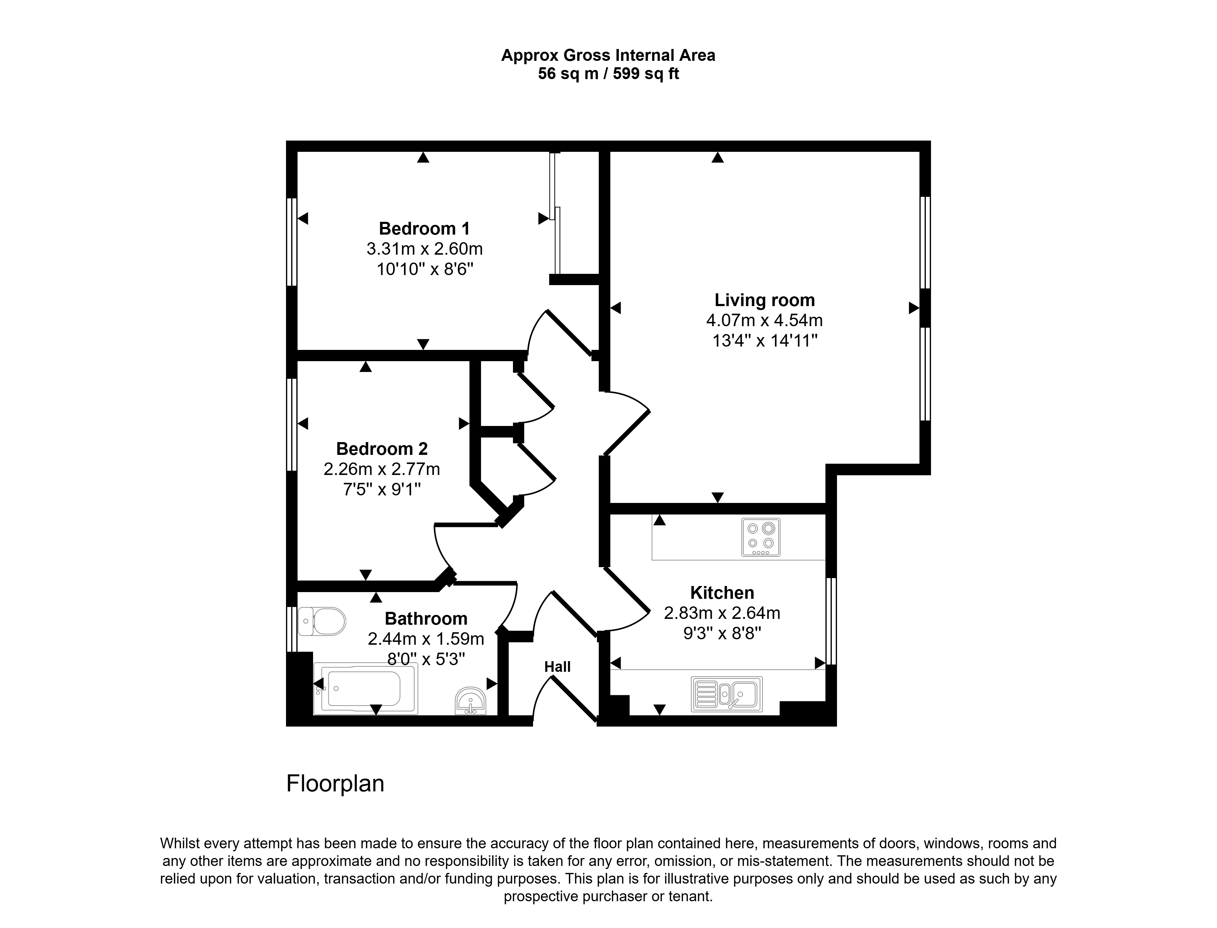 The large living room is flooded with natural light, providing a great space for relaxation and entertaining. The kitchen, while in need of updating, has ample storage and workspace, making it ideal for a stylish renovation. Both bedrooms are well-sized, with the main bedroom comfortably fitting a double bed and additional furniture. The bathroom, complete with a bathtub and shower, is another area that could be modernized to suit contemporary tastes.