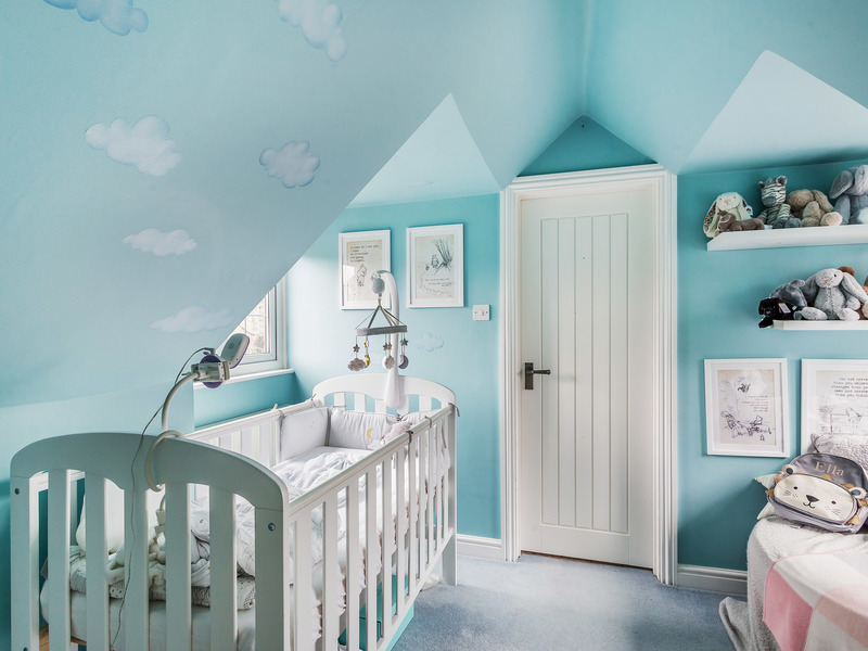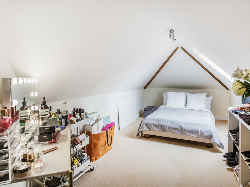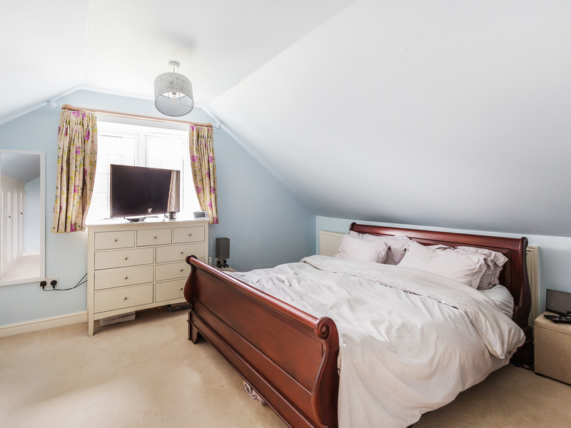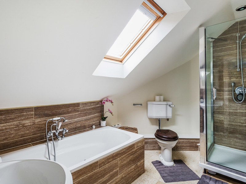 Upstairs the central landing leads the way to three additional bedrooms with high sloping ceilings. Natural light tumbles into the principal bedroom adding a calm and peaceful feel and a wall of fitted wardrobes gives a fantastic amount of storage without encroaching on the aesthetics of the room. Arranged in a sultry driftwood tile setting the en suite bathroom with an inset bath and glass framed walk-in Aqualisa shower adds a touch of luxury. Equally well-presented and proportioned two further bedrooms each with their own en suite bathrooms offer flexible family accommodation.