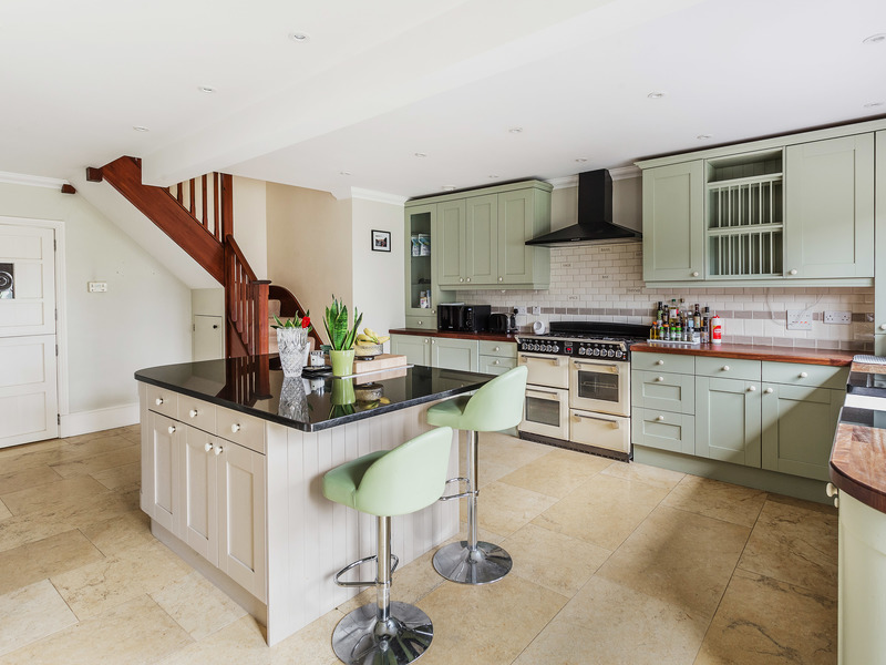 Adding to the hugely sociable feel of this home the spacious kitchen/breakfast room is accessible via an archway from the dining room and also a charming split stable-style door from the hallway. Contemporary, elegant and superbly functional for a busy family lifestyle, its wealth of Shaker-style cabinets wrap-around to supply an enviable amount of storage housing a range cooker and American-style fridge freezer. The etched grooves of bespoke granite countertops flow into a butler sink and additional wood countertops produce ample workspace, while further French doors make it easy to enjoy al fresco meals. Well-appointed to give every convenience with an integrated dishwasher, tumble dryer and washing machine, this inviting space benefits from a wonderful central island with a breakfast bar and integrated wine fridge, along with an under- heated stone tile floor.