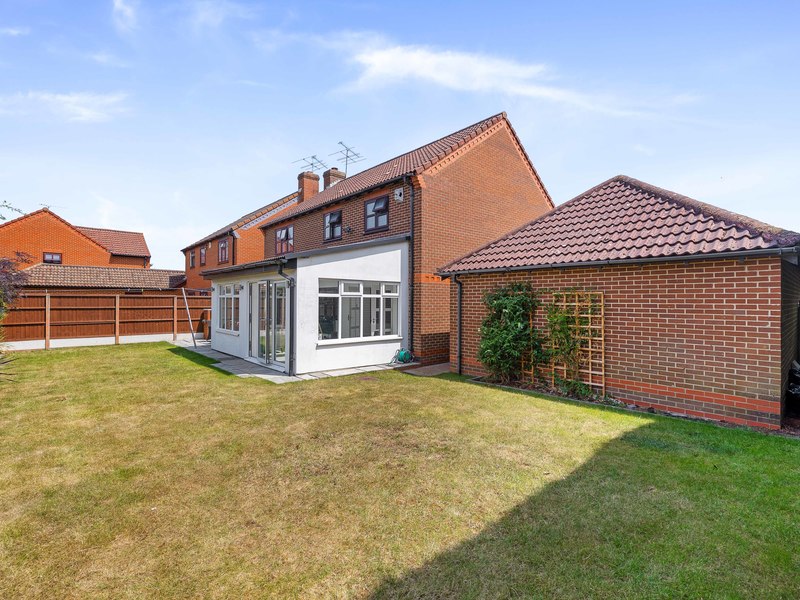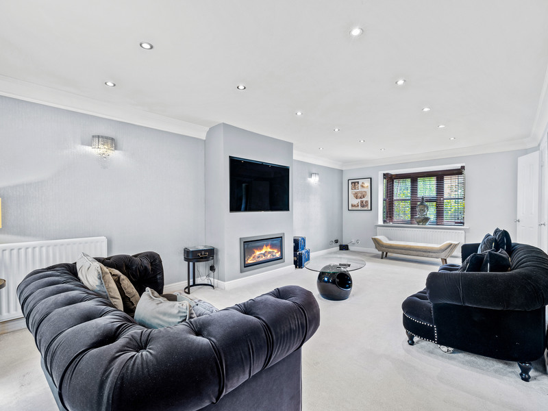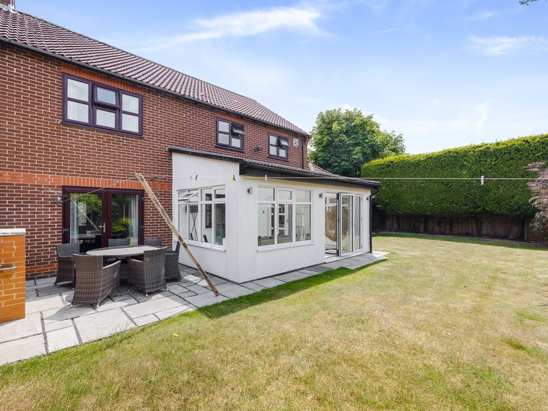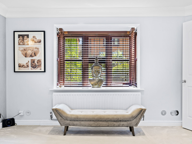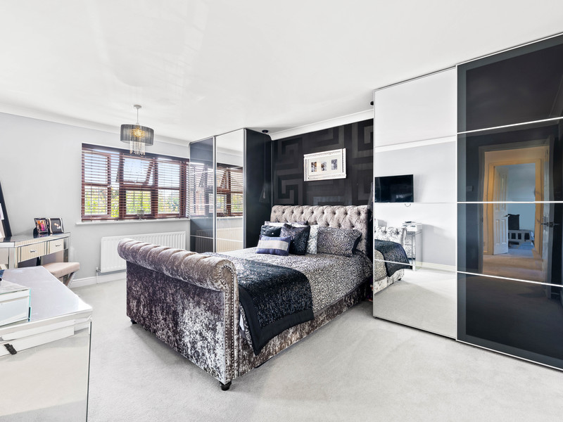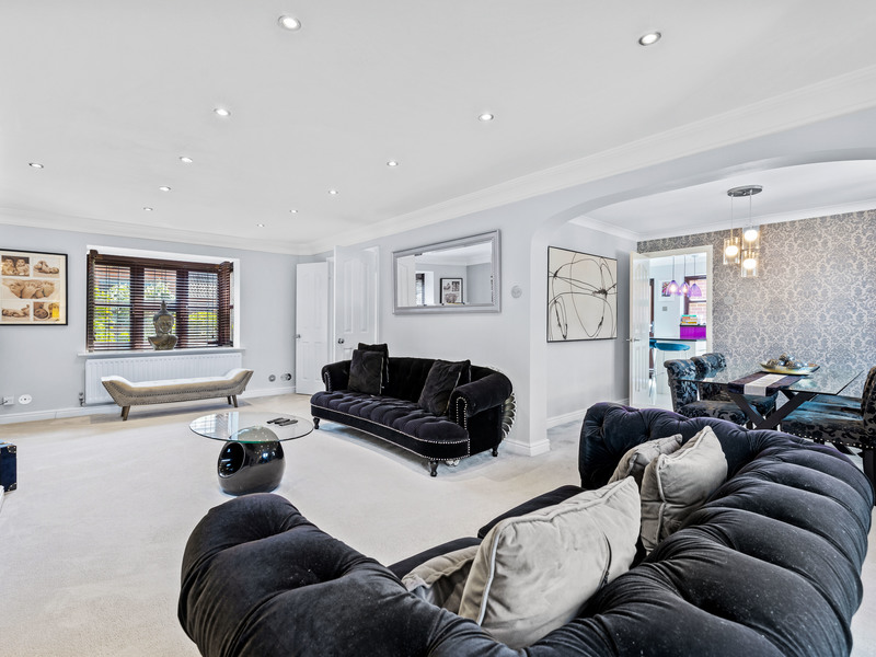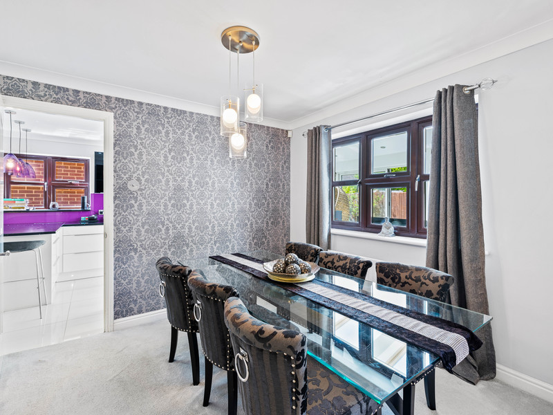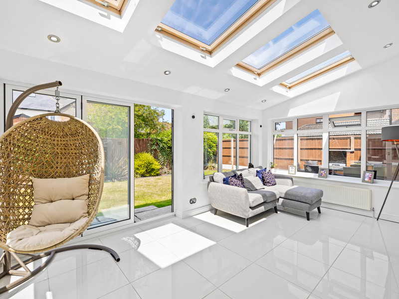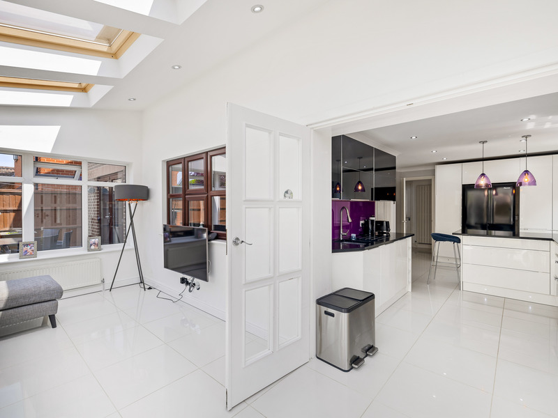 Step inside to discover a seventeen foot living room that flows seamlessly into a dedicated dining space and onto a sun-drenched conservatory, all overlooking the landscaped rear garden. The stylish kitchen—with its glossy finish, vibrant accents and breakfast bar—is a true heart-of-the-home space, perfect for morning coffees or evening catch-ups.