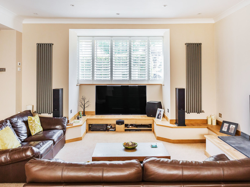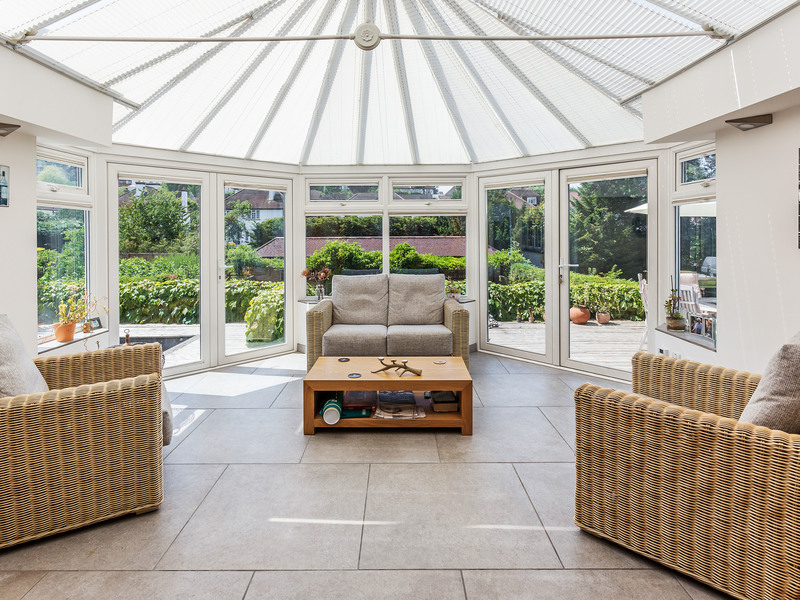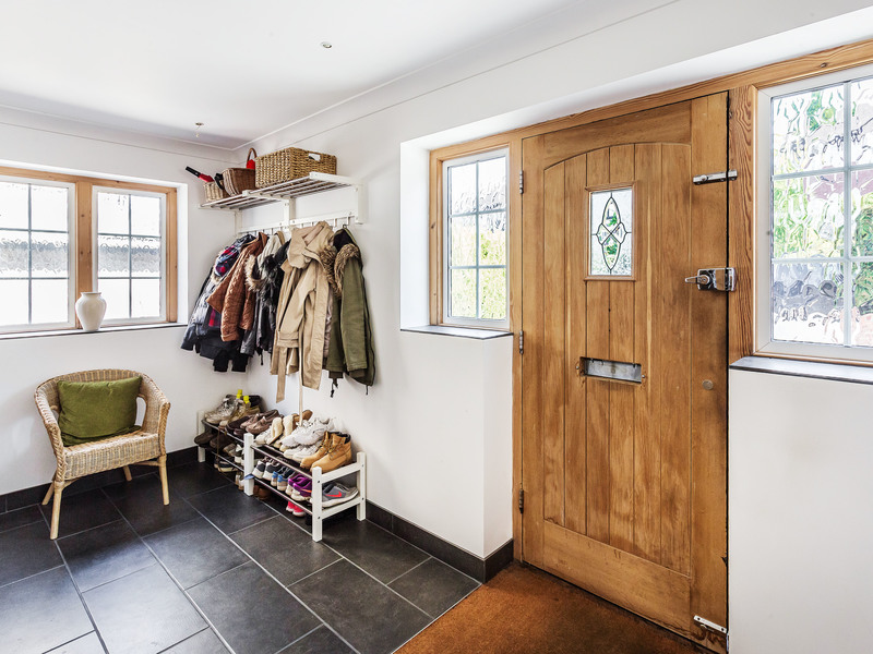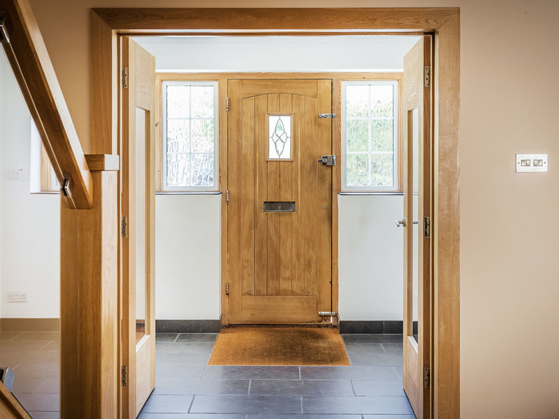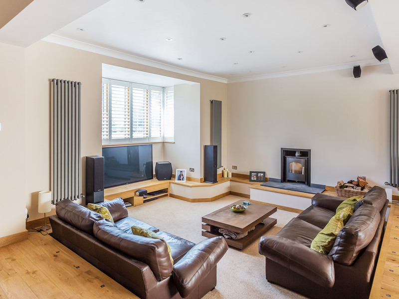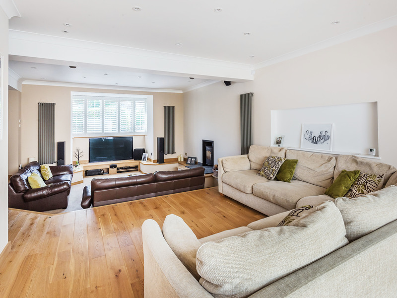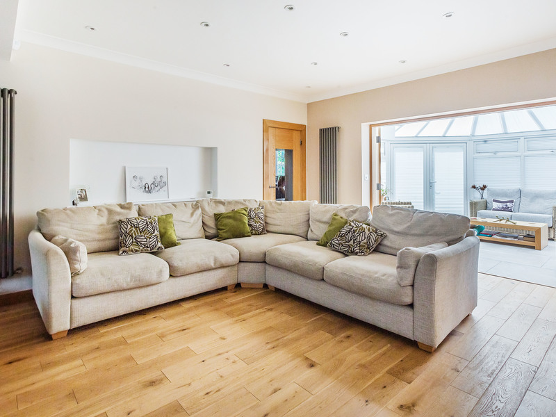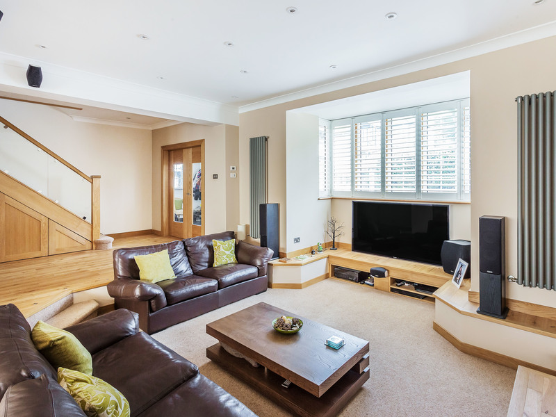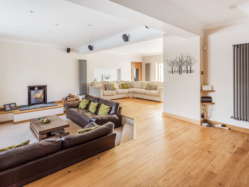 The spacious and light entrance hall leads to a stunning open-plan sunken living/reception room, from which you can access the study, conservatory or kitchen diner.
