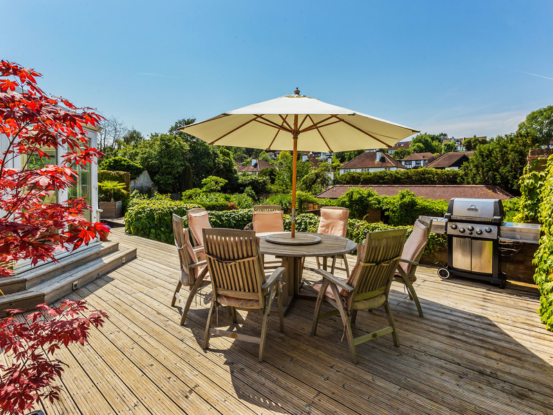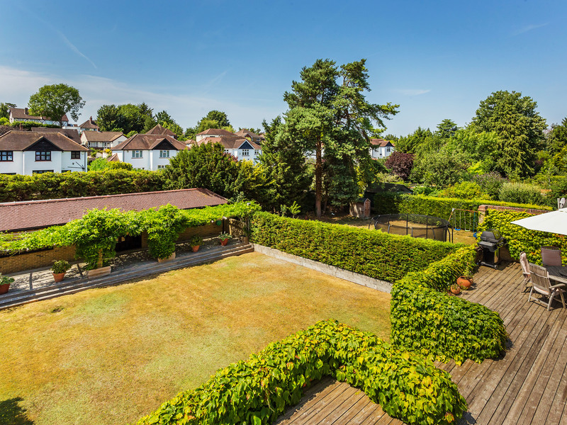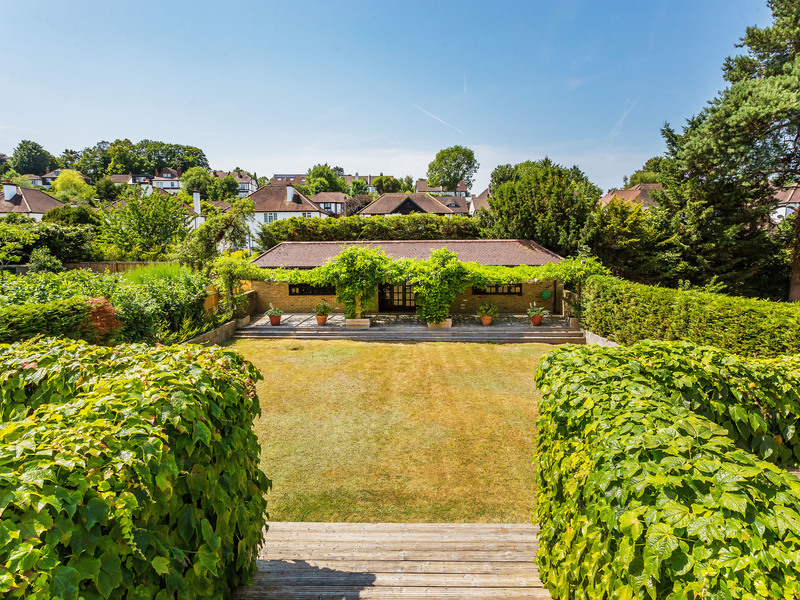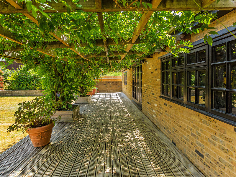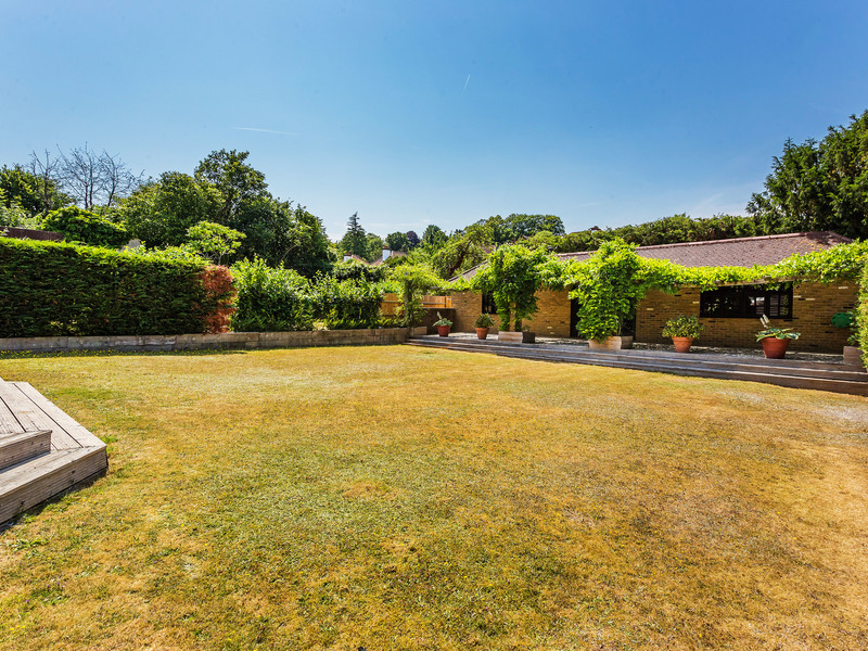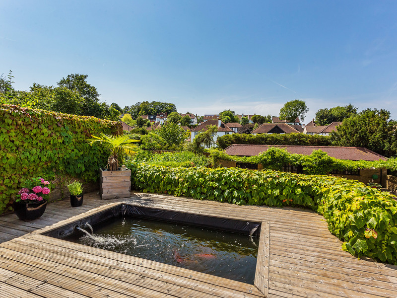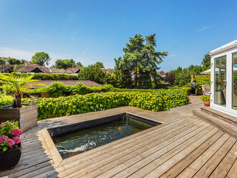 The garden can be accessed by both conservatory and kitchen. A large attractive patio area with a small pond overlooks the extensive lawn and very attractive annexe/outbuilding. The outbuilding is sizeable at 554sq ft and has been designed in a way that does not overpower the garden. When in bloom the wisteria adorning the annexe it is a delight to see. The brick built outbuilding has electricity and water and would only need minor additions to be used as an annexe.