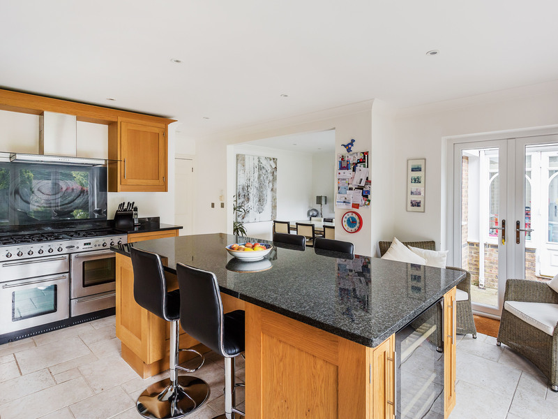 The Kitchen has beautiful handmade ‘Small Bone’ units and there is an open plan dining area, utility room and cloakroom, with bi-fold doors leading onto the terrace and garden.