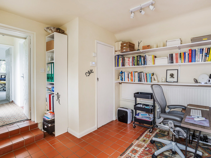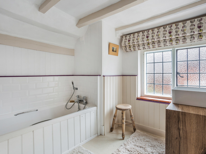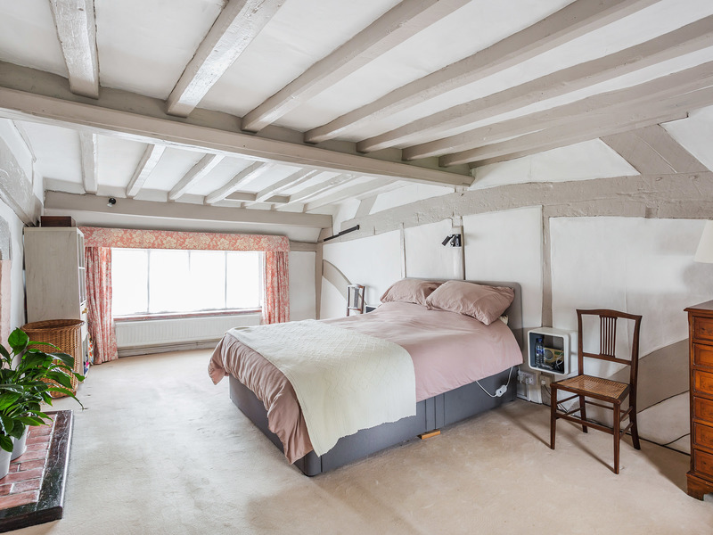 The sense of space and lovely flow of natural light continues upstairs in each of the four equally well-presented double bedrooms each with more of those exceptional timber beams. On the first floor two bedrooms both feature exposed brick fireplaces, and whilst the double aspect principal bedroom looks out over the gardens, the second bedroom has an enviably sized walk-in wardrobe. Two further bedrooms stretch out across the top floor, while the modern suite of the recently updated family bathroom is a superb finishing touch with its wood panelled bath, stylish countertop basin and metro tile setting.
