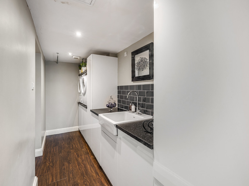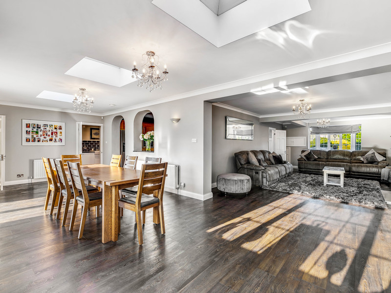 As you enter, the property greets you with a spacious entrance hall that leads to an expansive open-plan living area. The ground floor features a bright and airy living room that flows seamlessly into a formal dining area, perfect for hosting large gatherings. Both rooms benefit from large windows and patio doors that open out to the garden, flooding the space with natural light. A modern, well-appointed kitchen with granite countertops, an island, and integrated appliances caters to all culinary needs.